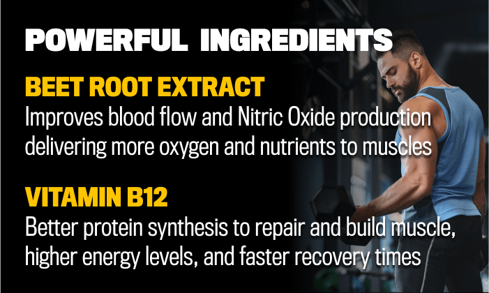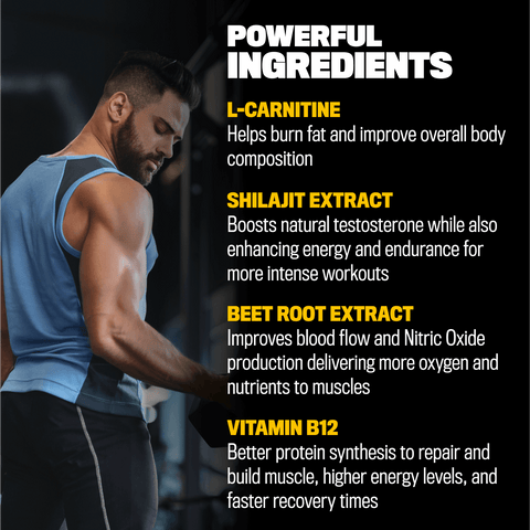 Ingredients: Beetroot Extract 10:1 Ratio, L-Carnitine L-Tartrate, Bulking Agent (Microcrystalline Cellulose), Capsule Shell (Hydroxypropyl Methylcellulose), Shilajit Concentrate 4:1 Ratio (Asphaltum) (Whole Bituminous Sub), Ferrous Fumarate, D-alpha tocopherol Acetate, Anticaking Agents (Silicon Dioxide, Magnesium Stearate), Retinol Acetate, Copper Sulphate, Pyridoxine HCI, Folate, Methylcobalamin.